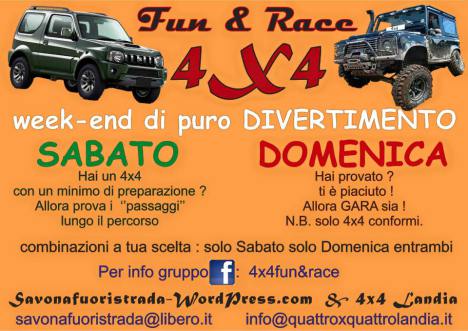 In collaborazione con Savona Fuoristrada, è stata allestita una pista di circa 1,5 km per gli amanti del fuori strada. I partecipanti alla manifestazione, pilota ed eventuale navigatore, devono essere in possesso della tessera FIAMMA FUORISTRADA valevole per l’anno 2016 (coloro che ne fossero sprovvisti possono richiederla all’organizzazione almeno 10 giorni precedenti l’evento utilizzando il modulo in allegato). Il tesseramento comprende la polizza assicurativa annuale sugli infortuni con contratto nominale che verrà consegnata insieme alla tessera il giorno della manifestazione. Il tesseramento da diritto a partecipare a tutte le manifestazioni organizzate sul territorio nazionale dal FIAMMA FUORISTRADA per l’anno 2016.